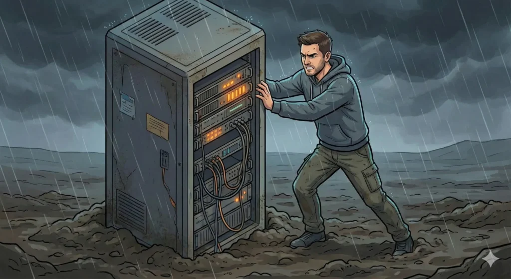 Prompt 2 (Using Reference): “[Reference Image: Sam]. The same character from the reference image is looking frustrated, pushing with all their might against the bulky on-premise server rack, which is stuck in mud. Dark, cloudy atmosphere. Digital art style.”