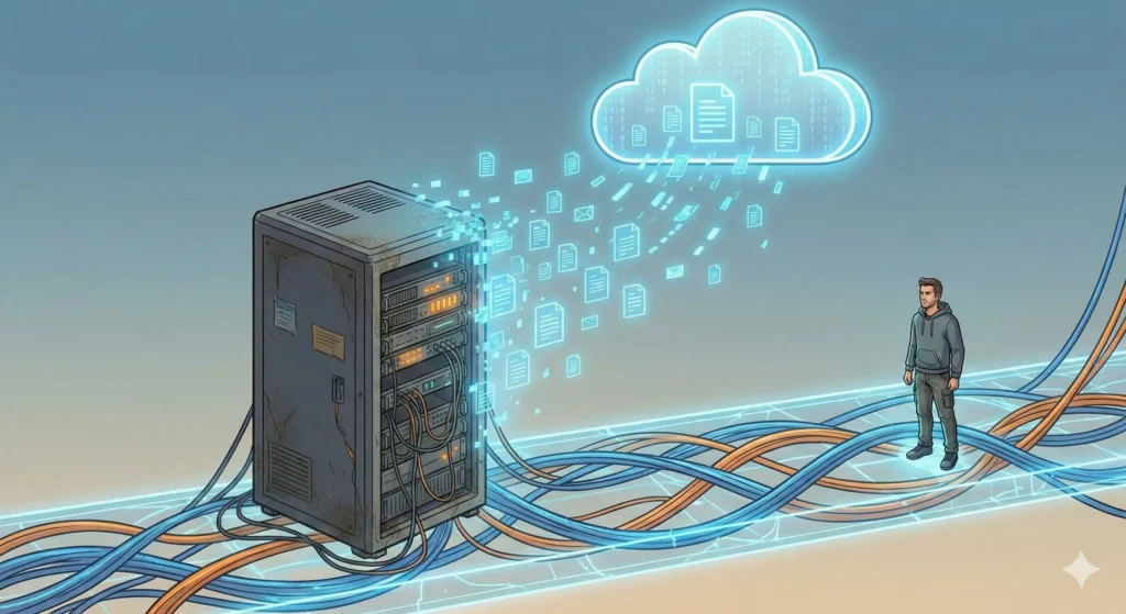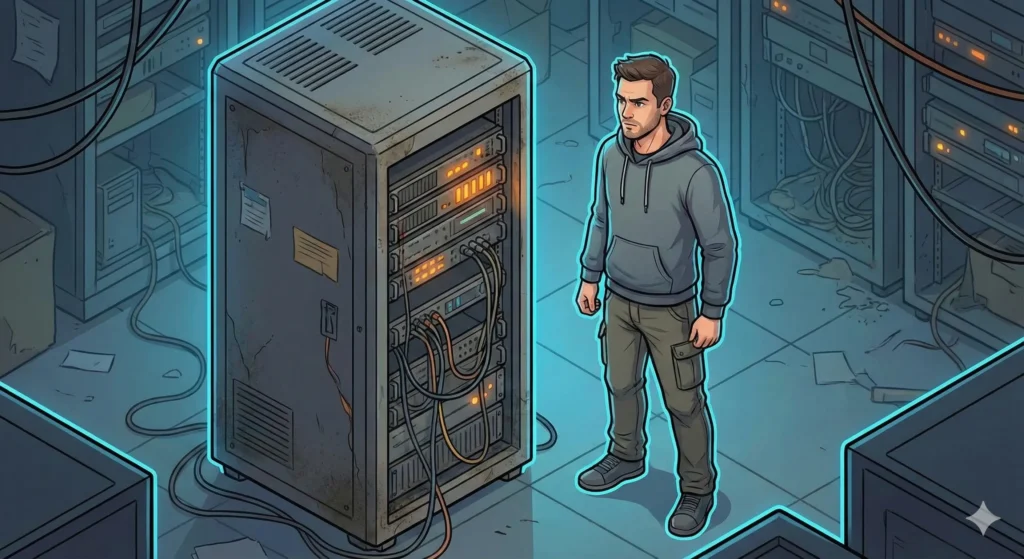 Prompt 1 (Defining the Style): “A stylized illustration, isometric view, digital art style with glowing blue and orange accents. A determined IT specialist, mid-30s, wearing a hoodie and cargo pants, standing next to a bulky, dusty, old-fashioned on-premise server rack with tangled wires. The style should be clean but detailed.”