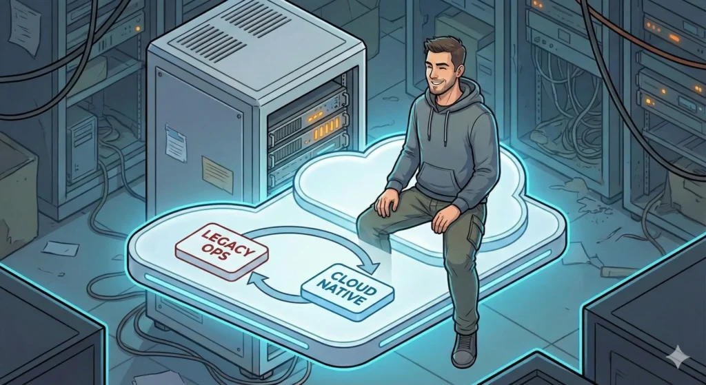 Prompt 4 (Text & Consistency): “[Reference Image: Sam]. The same character is smiling, sitting peacefully on a sleek, modern, glowing cloud platform. Below them, a clean diagram shows two boxes connected by an arrow. The left box is labeled ‘LEGACY OPS’ in red text. The right box is labeled ‘CLOUD NATIVE’ in blue text. The overall style is clean digital illustration.”
