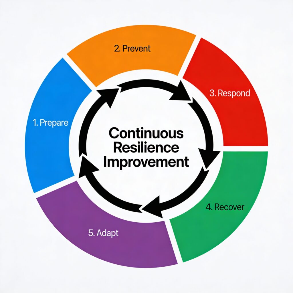 Resilience isn’t built through one-time initiatives or crisis response playbooks. It’s built through continuous cycling through the framework, embedding learning into culture, and treating preparedness as an ongoing discipline. Organizations committed to this continuous improvement mindset emerge from disruptions stronger, more adaptable, and better positioned for long-term success.